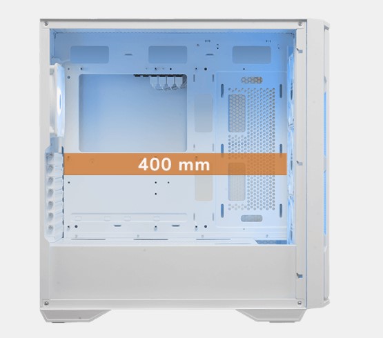 Корпус розрахований на максимальну довжину графічного процесора 400 мм з можливістю горизонтальної/вертикальної орієнтації без кріплень, забезпечує простір, необхідний для збірки та розширення вашої системи відповідно до ваших вимог.