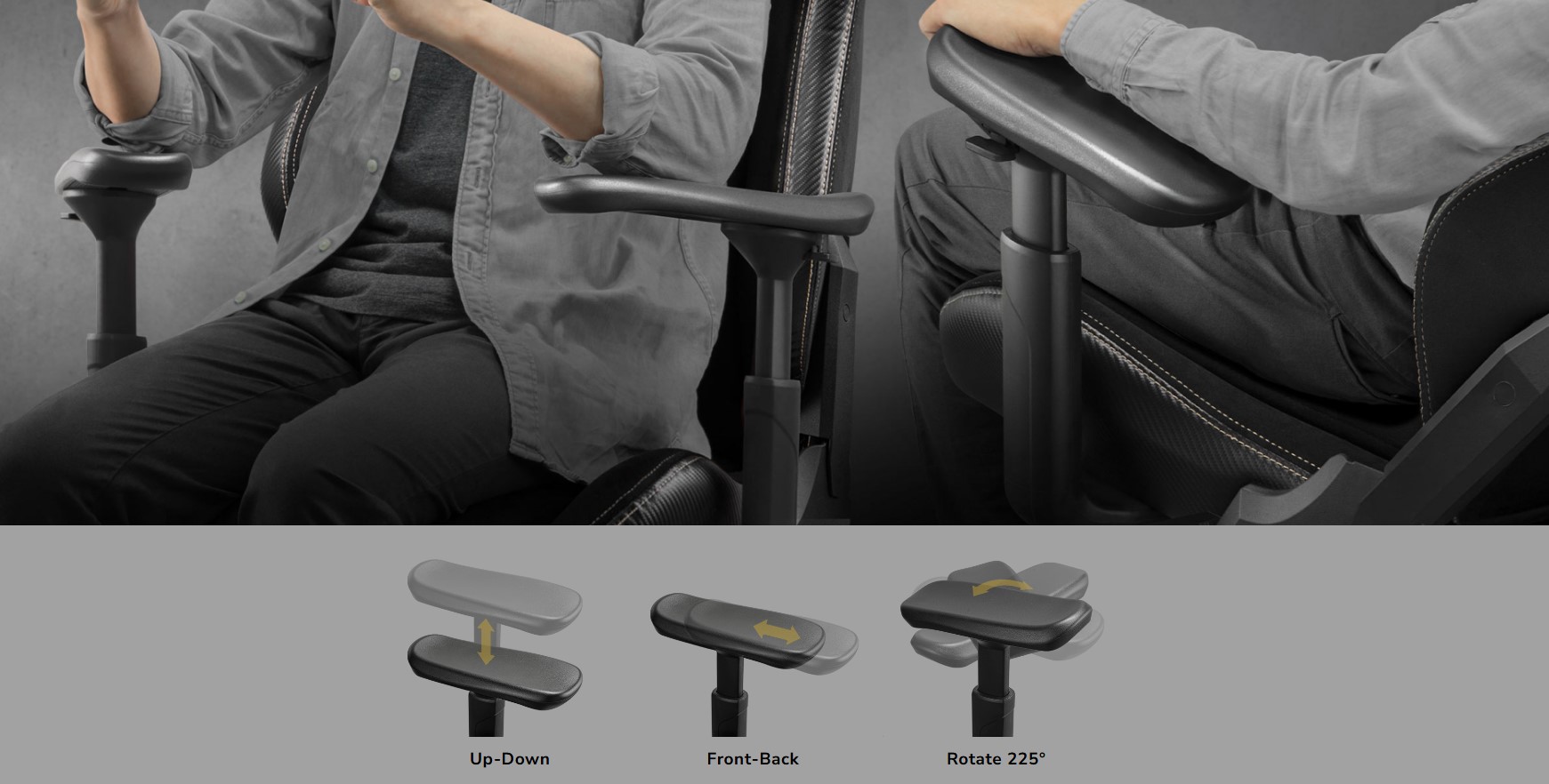 Підлокітники обертаються в діапазоні 225°. Це забезпечує більш ергономічне та зручне положення рук під час мобільних ігор або у відкинутому положенні крісла.