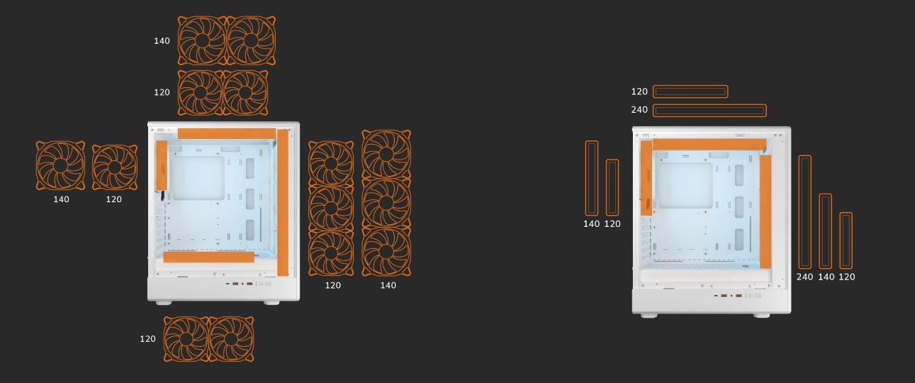 - Спереду: 240 / 140 / 120 мм (Радіатор встановлюється або спереду або зверху)