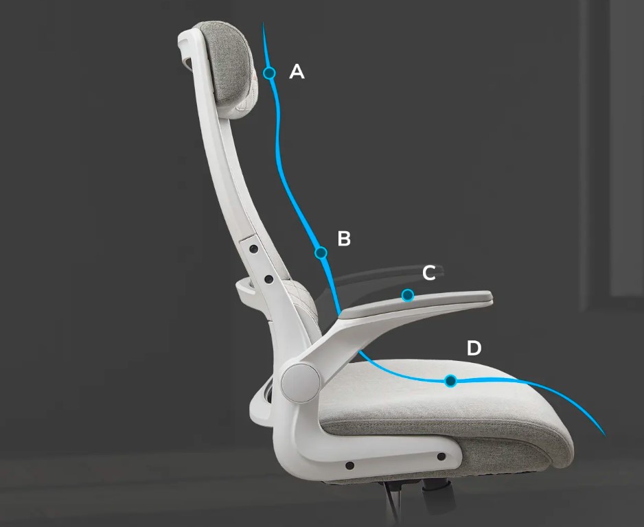 - B. Спина і поперекова область: Ергономічна спинка природним чином повторює вигини хребта, забезпечуючи повну підтримку від плечей до нижньої частини спини